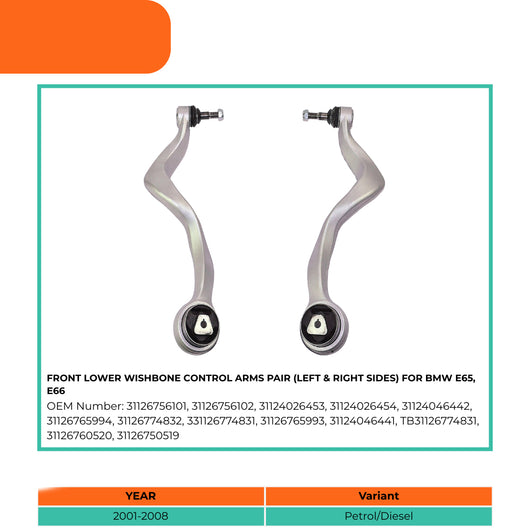 All our control arms, suspension rods & components are OEM quality and reliable after market car parts. This Front Lower Wishbone Control Arms Pair (Left & Right Sides) For Bmw E65, E66 is specifically compatible with BMW 7 Series E65, E66, E67.
