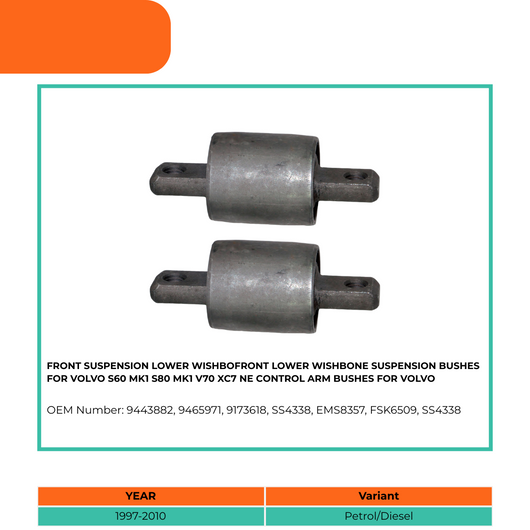 All our suspension bushings are OEM quality and reliable after market car parts. This Front Suspension Lower Wishbone Control Arm Bushes Kit For Volvo is specifically compatible with Volvo C70 I, S60, S60 I, S80, S80 I, V70, XC70 Cross Country.