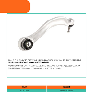 All our Front Right Lower Forward Control Arms are OEM quality and reliable after market car parts. This Front Right Lower Forward Control Arm is specifically compatible with Alpina: B7, BMW: 5 Series, 7 Series, Rolls-Royce: Dawn, Ghost, and Wraith.